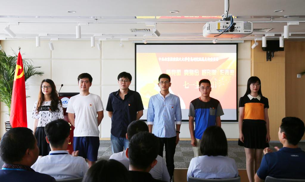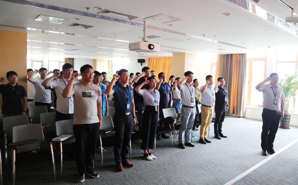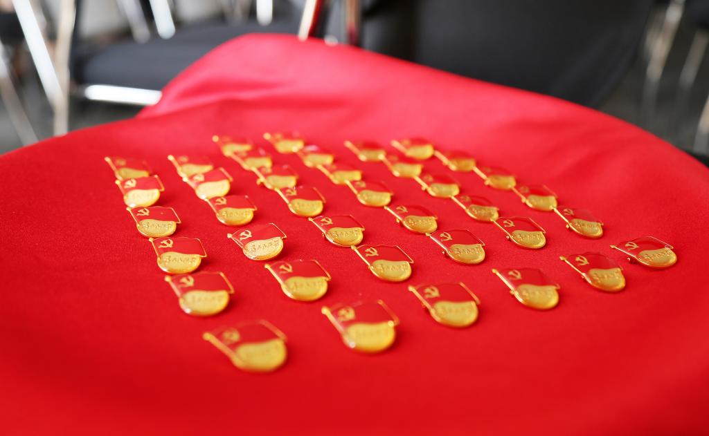 党徽凝聚责任,誓言昭示力量。伴随着激昂的《没有共产党就没有新中国》乐曲,高振岳书记为党总支和各临时支部的委员授予党徽,各临时党支部的书记、组织委员分别为本支部党员授予党徽。佩戴上闪亮的党徽,面对鲜红的党旗,全体党员高举右拳,重温让人热血沸腾的入党誓词。最后,大会还安排了观影活动,通过观看军事题材爱国主义电影《红海行动》,进一步激发了全体党员爱党报国、岗位建功的热情。